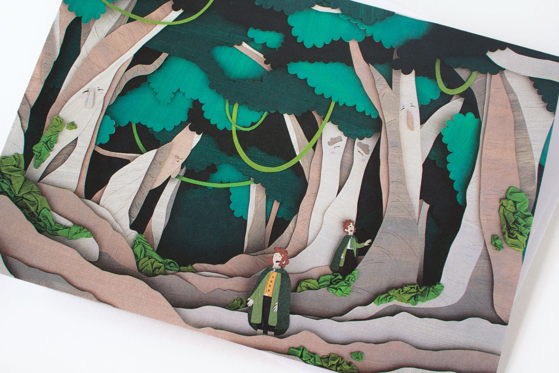 This folded card is inspired by the moment where hobbit Merry and Pippin wake up some ents in Fangorn Forest.
