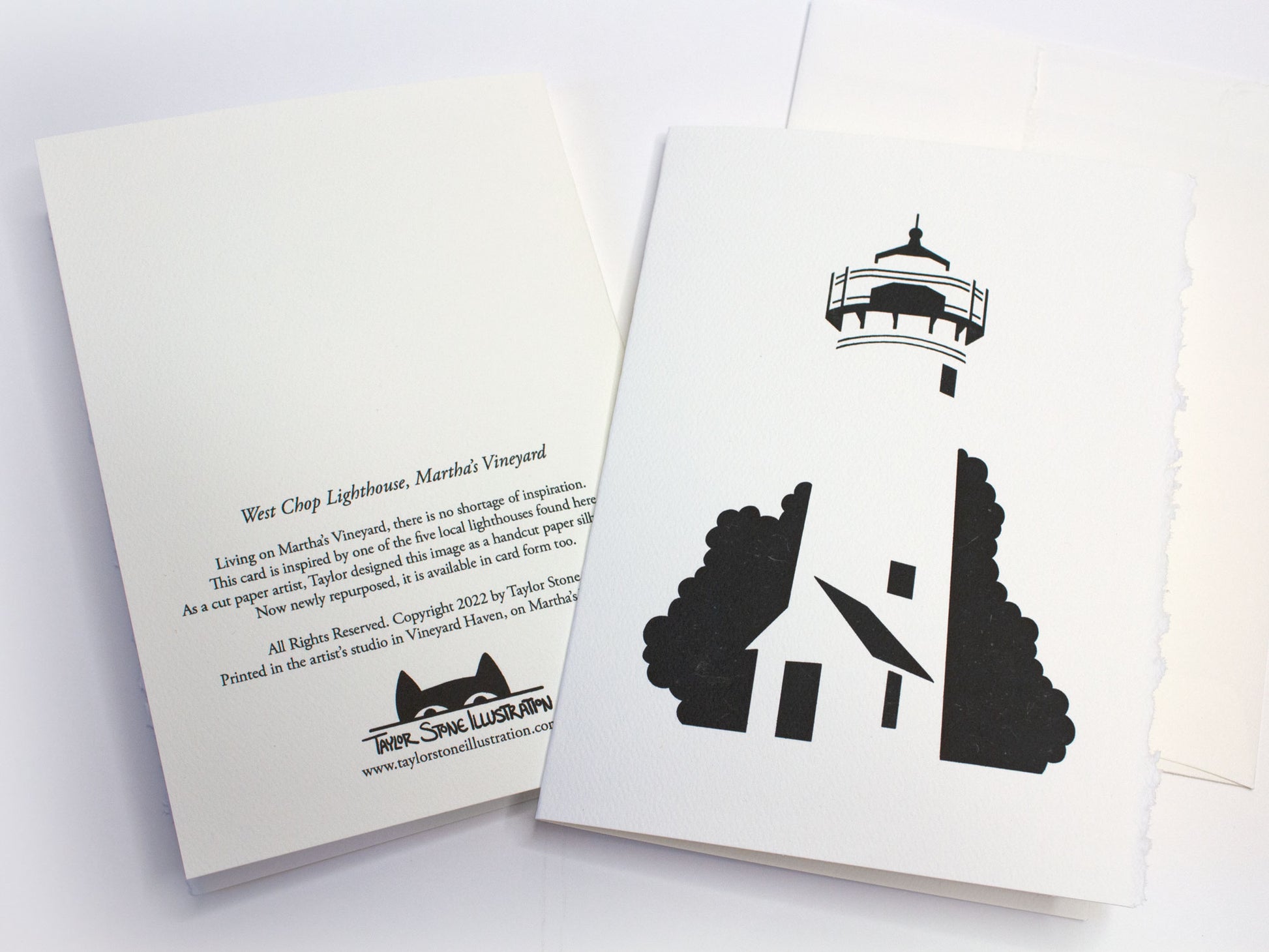 This card is based off the design I use for my hand cut lighthouse silhouettes featuring local Martha's Vineyard lighthouses. Specifically, this one shows the West Chop Lighthouse in Tisbury (or Vineyard Haven): the year-round port for Martha's Vineyard. Deckled edge detailing, envelope included, blank inside.
