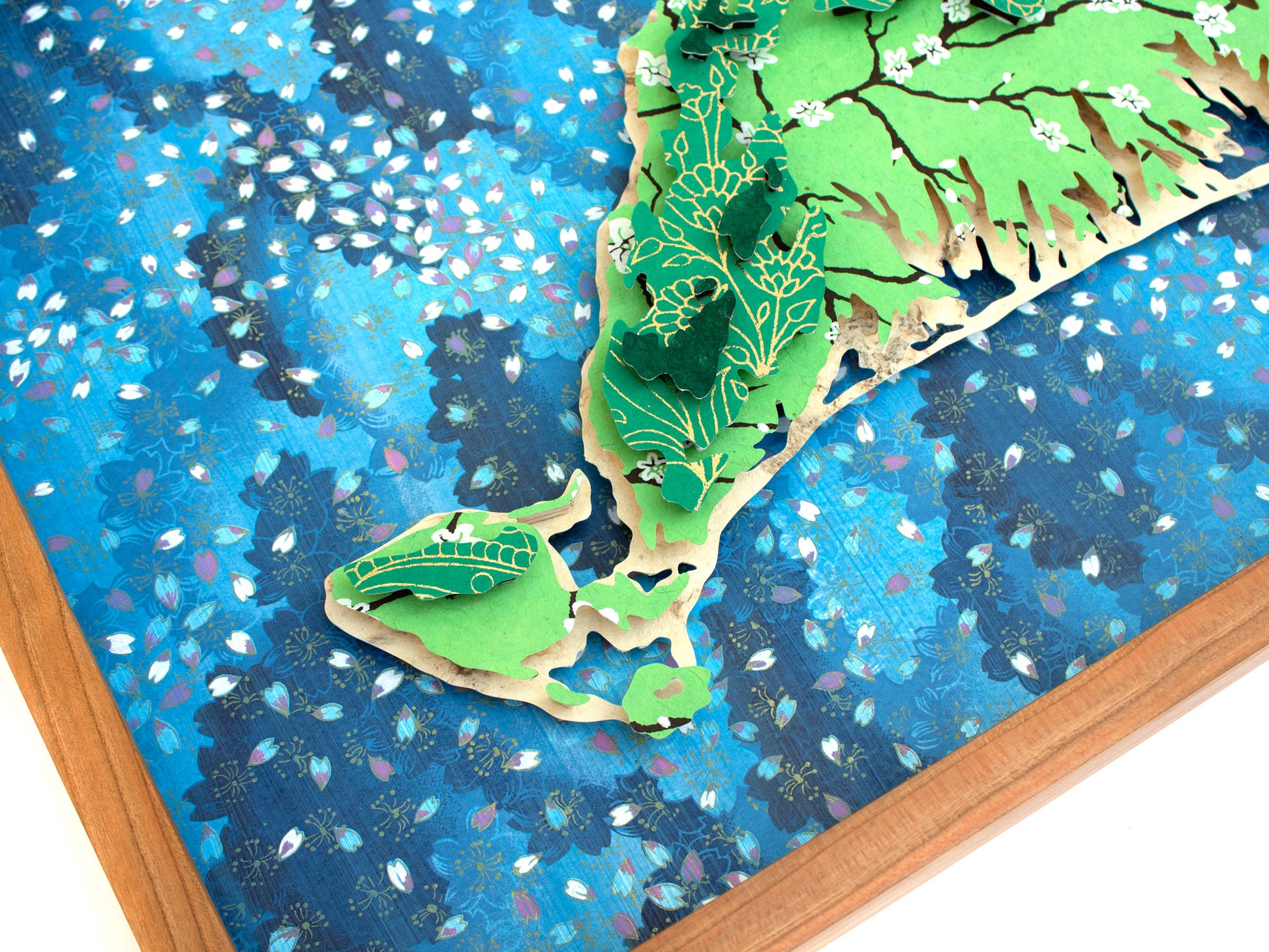 This original cut paper illustration is a topographical map of the island of Martha's Vineyard, Massachusetts. Featuring a mix of Japanese floral and other handmade papers, this was all cut and assembled by hand before framing in a custom made cherry shadowbox frame.