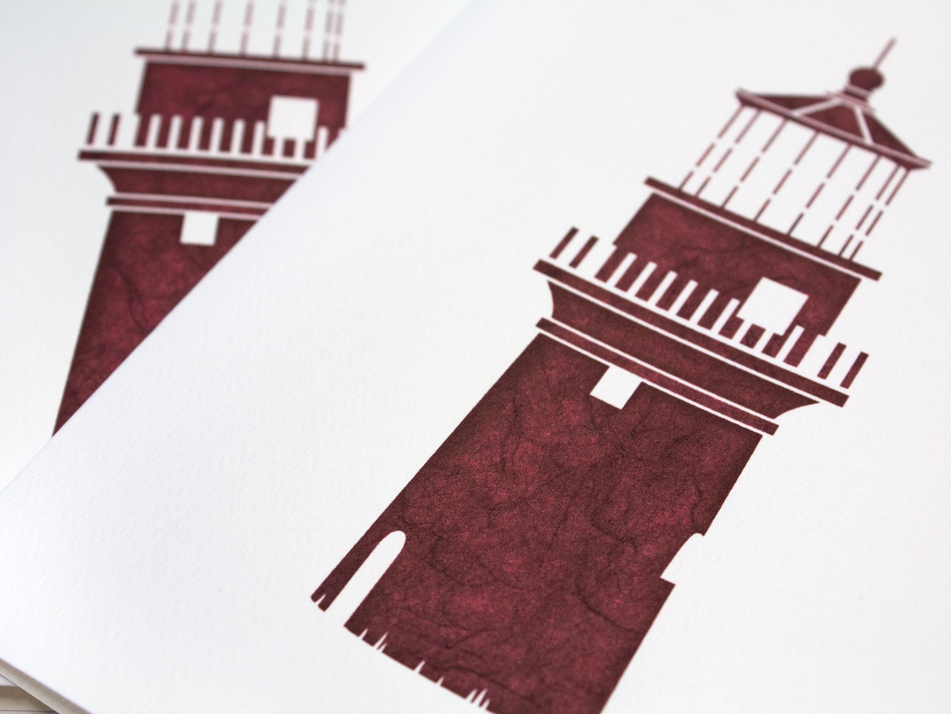 This card is based off the design I use for my hand cut lighthouse silhouettes featuring local Martha's Vineyard lighthouses. Specifically, this one shows the iconic Gay Head Lighthouse in Aquinnah on the tribal lands of the Wampanoag tribe. Deckled edge detailing, envelope included, blank inside.
